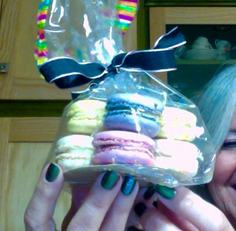 From a friend from KSU, a batch of home-made macarons, wrapped in a beautiful package and delivered right to our door!  Can you spell lucky? Lucky Sally? Yeap. That just about sums it. They were beyond delicious, my favorite was the pink one filled with strawberry jam. Jam made from scratch, in case you are wondering.