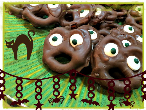 They were fun to make, even if slightly messy. But that could very well be operator-error. I am not that skilled when it comes to melted chocolate. You will need a bag of pretzels, melting chocolate (the best kind is this one, according to many sources), and eyeball candy. Sounds scary, right? Well, it’s for Halloween, it must be scary!