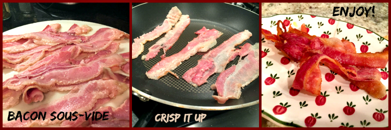 Should I be embarrassed to blog about a “recipe” that is essentially two ingredients plus seasoning? Potentially, yes. But in reality I am not, because this non-recipe has a nice little unexpected twist to it: the bacon was pre-cooked sous-vide. WAIT! Don’t run away, you can make it if you don’t have the Anova gadget sitting in your kitchen drawer. But I must say bacon cooked sous-vide and stored in the fridge waiting to shine in any recipe is a very nice item for the busy cook. Or any cook, actually, because this method gets quite a bit of the greasy “feel” of bacon out of the equation, and the texture will be superb.