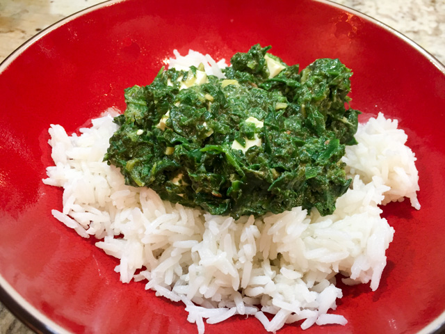 Add the spinach puree and a tiny splash of water if necessary. The puree should be loose, but not watery.  Bring this to a boil and simmer for 3 minutes. Add the garam masala powder, paneer cubes and milk. Stir and cook for a few minutes till the spinach is nice and creamy. Add lemon juice to taste. Serve over rice.