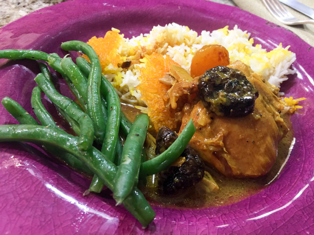 The planning of my beloved’s Birthday dinner went all backwards. First I settled on the dessert, covered in my previous two posts. You know, the dessert that almost killed me. Then, I chose the side dish. Rice. Rice for a Birthday dinner? Yes. But let me explain. Ever since I met Phil he talks about this Persian rice his roommate used to prepare when they lived in their communal house. I call those times his hippie-days, I’ve seen pictures, and can tell you he was almost as handsome then as he is today. Back to rice. It is very traditional in Persian cuisine, countless ways to make it, probably each family has its own way, like feijoada for Brazilians. The ultimate goal is to produce a golden crust at the bottom of the pan, which when the rice is served, ends up on top. You break that crust and enjoy it with the perfectly cooked and perfumed rice underneath it.  I don’t know why it took me so long to finally make it at home, but better late than never. And with the side dish decided, I picked a main dish to match:  chicken thighs braised in Middle-Eastern spices, cooked with dried apricots and prunes. Green beans tied it all together…