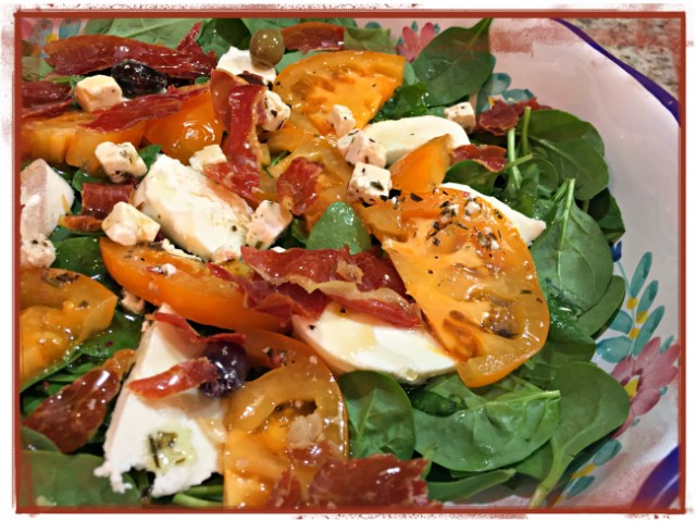 Comments:  If your grocery store doesn’t sell those containers with marinated olives, move.  Just kidding. You can make the dressing yourself, just add some herbs to olive oil, such as oregano, thyme, to give it more flavor.  The prosciutto crisps are so delicious, they are actually the second interesting twist I mentioned. They offer a very nice crunch to the salad, much like nuts would do. Or those incredibly addictive crispy chow-mein goodies that are not allowed in our home. I have zero power against those. Once the can is open, it all goes downhill. Fast. Anyway, as far as indulgences go, prosciutto crisps are not that bad.  Four slices are more than enough for a salad made for two, with some bits to keep you happy while getting the salad ready.  And, by the way, speaking of indulgences, if you’d like to take this salad over the top, use burrata instead of mozzarella…