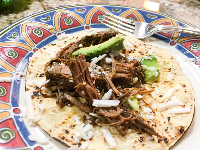 Pour sauce through a fine wire-mesh strainer into a medium saucepan, and cook over medium-high heat, stirring occasionally, reducing it for about 10 minutes. Stir the apple cider vinegar. Coarsely shred the brisket, add the sauce and mix. Serve over tortillas, or white rice, with your favorite toppings. I served with avocado slices and crumbled Cotija cheese.