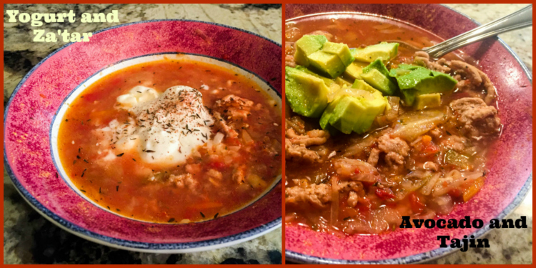 Anyway, for this sequential lunches, I varied the toppings. On the first day I added shredded Gruyère, second time around a dollop of yogurt and Za’tar (never get tired of this spice mix). Finally, on the third day I crowned it with diced avocado, a heavy squirt of lemon juice and a touch of Tajin (another spice mix I am quite fond of). The soup got a bit thicker on the third day, but I did not add any water or beef broth to it, just enjoyed it the way it was. If you visit Sugar Free Mom’s site, you’ll noticed she used ground beef, so keep that in mind as an option too. I know this will become part of my regular menu, and not just when I feel the need to go low on carbs. It is delicious!