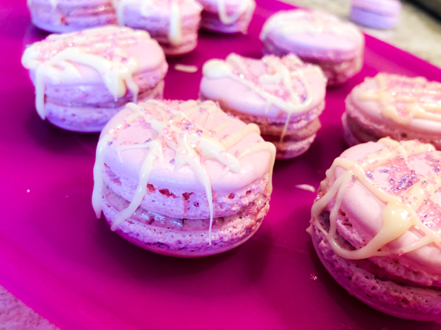 Bake for 18 to 20 minutes. They are ready when the top doesn’t move freely when you hold them and twist gently. Let cool slightly before removing from baking sheet. Marry two by two of similar size, add the filling. Melt white chocolate and add to a small bag. Cut a small opening with scissors and drizzle white chocolate on top of the filled macarons. White the chocolate is still warm, sprinkle the colored sugar on top. Place in the fridge overnight before serving them, at room temperature.