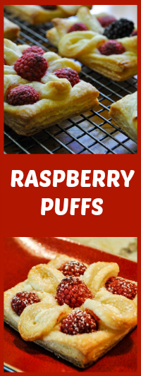 Roll the puff pastry and cut into 3 to 3.5 inch squares. Using the packaged pastry, one sheet will be enough to make 4 squares. Leaving a thin border, make cuts along the edges of the square. Use either a small rolling pastry cutter or a very sharp knife, so that you don’t squish the layers of the puff pastry. Place a tablespoon of the cream cheese filling in the middle of the square, then top with 4 raspberries. Take one of the edge flaps and fold it towards the center, looping over the raspberry. Repeat with the other flaps. Place a raspberry in the center, on top of where all the flaps overlap. Repeat with the remaining pastry squares.