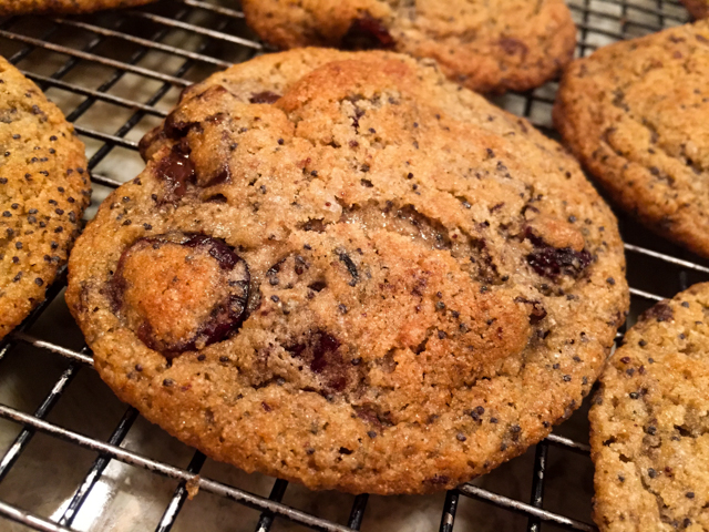Every once in a while Phil finds a recipe, sends it my way with a little comment: I think we-you should make this. His source is almost always the NYT Food section. I subscribe to that too, but confess to almost never clicking on it. I’m usually absorbed by my mile-long list of stuff I want to make. Soon. Anyway, last week he sent me a link about these chocolate chip cookies endorsed (with enthusiastic ravings) by Dorie Greenspan. You know, royalty in the food world. I made them that same evening, and into the fridge they went, for a mandatory period to mature the dough before baking. The dough contains a fair amount of rye flour. And poppy seeds. And dried cranberries. And chocolate chunks. A sprinkle of Maldon sea salt on top, a step that often makes me roll my eyes to the ceiling (like avocado toast does). But, trust me. It works. These might be the best choc chip cookies I’ve ever made.