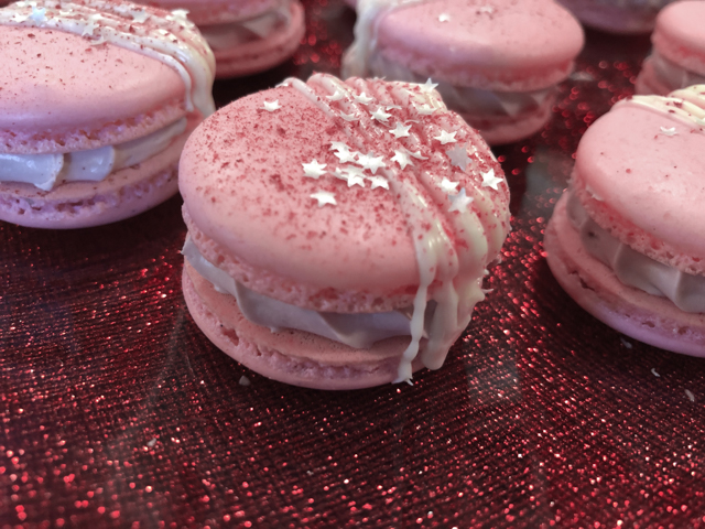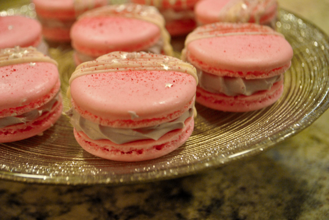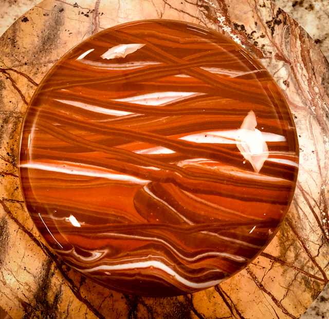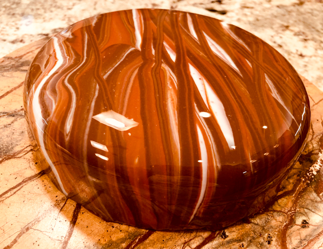 The mirror glaze. Wanna see it in action? Click here for a little video of yours truly in a very daring mode. Normally glazes are poured in the center, in a circular motion, but I wanted to get a more linear effect on the surface, so I went back and forth, in a movement that is usually reserved for log-shaped or savarin-type cakes. The glaze was just a tad too cold, and I got into a slight hyperventilation mode once I noticed. The temperature of the three glazes was very close to perfection to start with, but when I poured them together in a single container, they cooled a bit more. Mirror glazes are delicate beings, and hitting the temperature correctly for three different components can be a bit tricky. I am going to bring my bread proofing box into play next time. Still, it turned out pretty close to what I had in mind. I should not be too greedy…