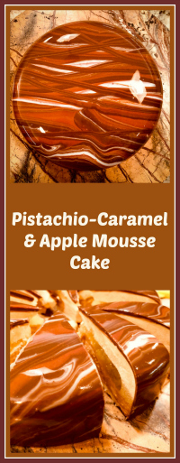 Comments: This recipe was designed around its apple center. Remember my little dome cakes from last month? I had quite a few of those little inserts of apple compote in the freezer, so I brought them to room temperature and re-froze in the Universo mold to be part of this new dessert. With that main component in mind, I searched for mousses that would complement it well. Not too long ago the amazing Miúda from the blog verdadedesabor made a pistachio mousse that left me dreaming. So I incorporated it. To add another flavor component, I re-visited a caramel mousse I made in the past and loved. Apple, pistachios and caramel sounded pretty good together. The sablé is my favorite type of cookie to use as a base because it is sturdy, tasty, and does not change shape during baking. I cut the cookie in the exact size of the mold, so it sealed it perfectly for freezing and made un-molding the dessert quite easy. Remember, measure twice and cut once.
