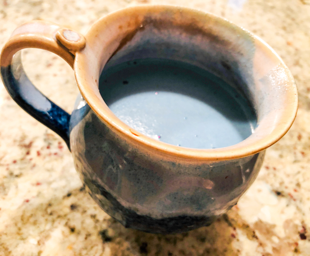 Comments: For this preparation, I think the powder is a must, as it is very concentrated and you don’t really need to boil the almond milk in order to get it properly dissolved. Another thing to keep in mind is that different brands of the butterfly pea powder have different strengths, mine is definitely stronger than Lindsay’s. I am now using 1/4 tsp of the powder for 1 cup of almond milk, and like the flavor better. It is hard to describe it, actually. Earthy, maybe? Along the lines of green tea but less sharp. I also liked it very much with cardamon instead of nutmeg. Below is a picture of a version with reduced amount of powder (1/4 tsp instead of 1 full tsp).