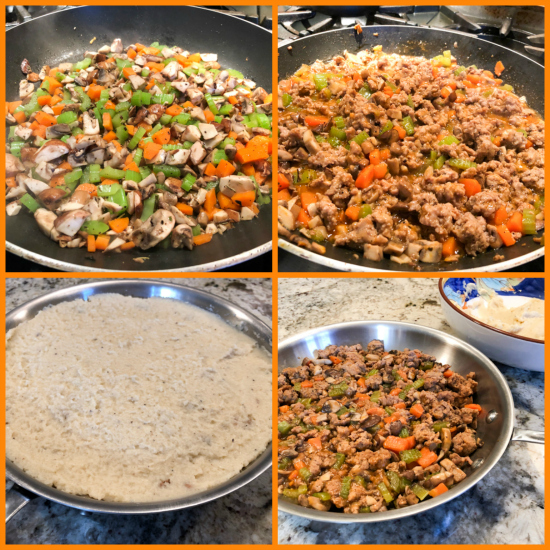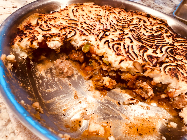 Pat the meat mixture to make it leveled, and spread the cauliflower puree all over the surface. If you like, use tines of fork to make a pattern of ridges on the surface. Place skillet under the broiler and broil for about 10 minutes, if necessary move the pan around to get homogenous color on the surface. Allow to sit for a few minutes before serving.