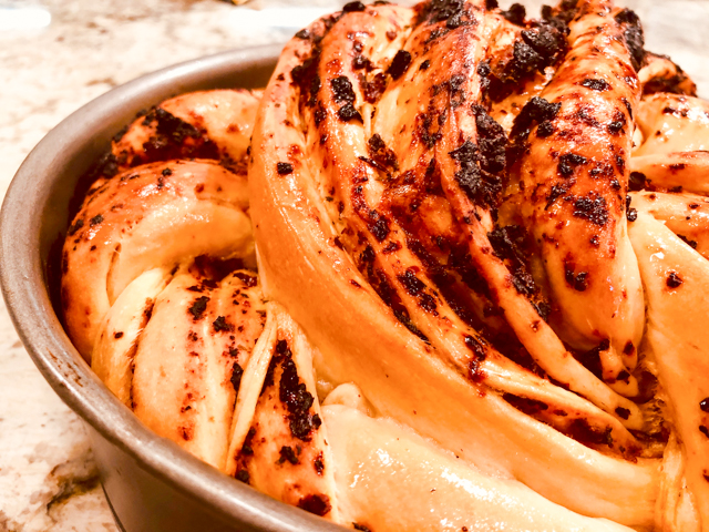 If you are a novice at bread baking, don’t let the shaping scare you, this is the type of dough that is very forgiving and even if you mess up the shaping a bit, it will look great. You don’t even have to do the twisted shape, you could braid the two halves of the dough, join the ends and call it a day.