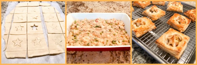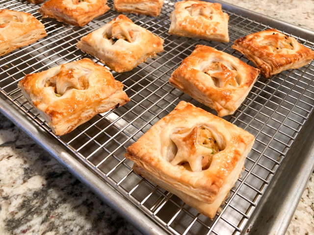 Place the squares that will be the bottom over parchment paper. Add enough cool chicken filling, brush the sides with egg wash, place the top pastry and push the edges to close it down. Brush the top with egg wash and bake at 400F for about 25 minutes, until golden brown.