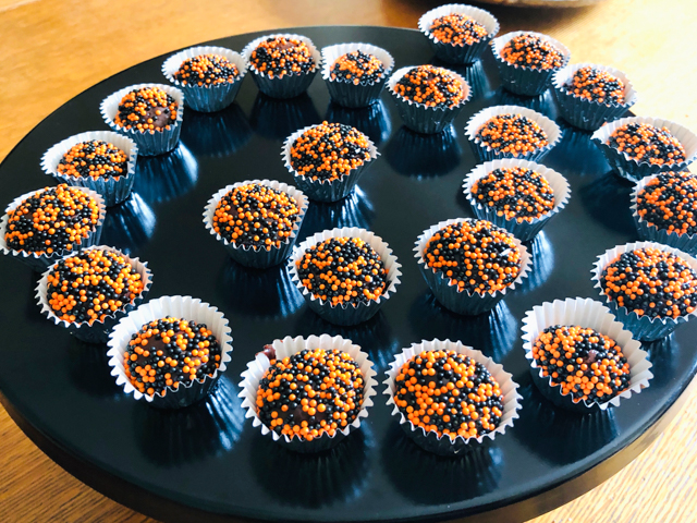Brigadeiros are the most typical candy from Brazil, and totally addictive. I used my default recipe and simply coated them with orange and black non-pareils. For the recipe and to read more about them, visit my old post with a click here.