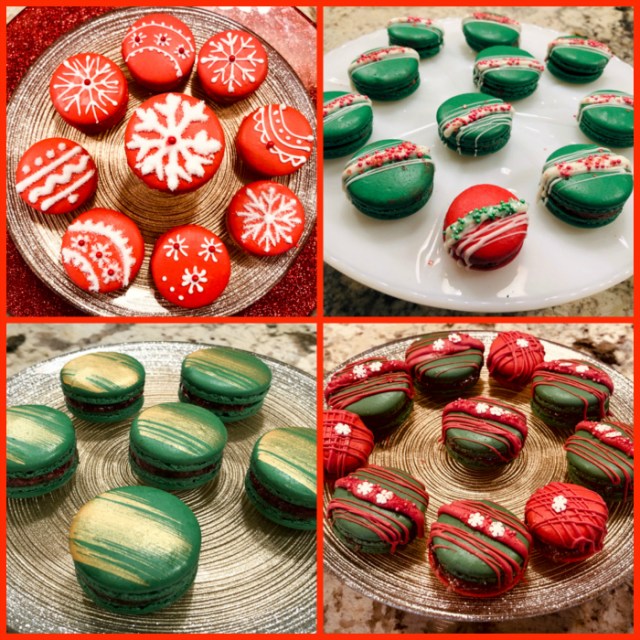 One recipe, two colors, four different ways to decorate, from simple to a little more time-consuming. It is definitely the reason why I adore macarons. You can dress them up for party or keep them simple, and play with filling flavors that match any season. For these Christmas-inspired versions, I filled some with raspberry jam and others with white chocolate-mint ganache.