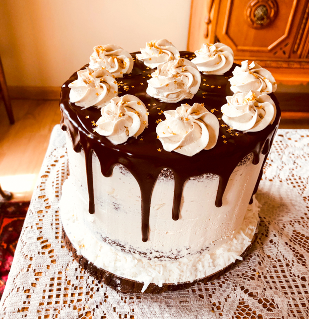 Add the heavy cream into a saucepan along with the shredded coconut. Simmer until it almost boils, turn the heat off, cover the pan and allow it to sit for 15 minutes. Drain the shredded coconut, bring the weight back to 375g with additional heavy cream. Bring to a simmer, then add to the chocolate. Add the gelatin, and mix well to incorporate everything together and melt the chocolate. Use an immersion blender if desired. Place the mixture in the fridge for a few hours. It is best if made the day before and kept refrigerated. Whip before using.
