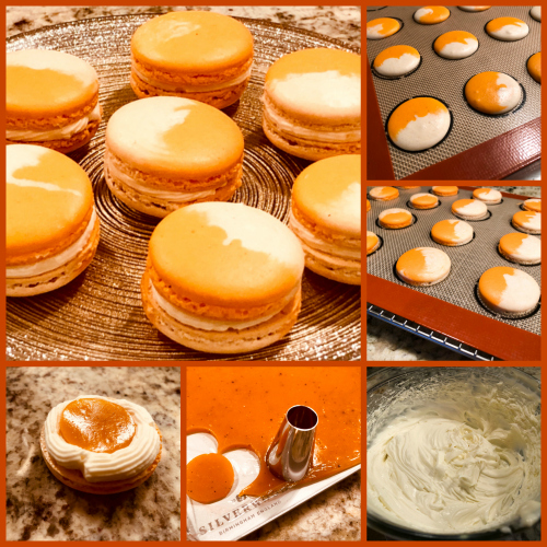 Fold in the almond meal mixture in three increments. Paint the mixture halfway up the side of the bowl, using the flat side of a spatula. Scrape the mixture down to the center of the bowl. Divide in two portions, color one orange, leave the other plain. Proceed with the macaronage, mixing each mixture to the correct texture (molten lava is the term of choice, I like to form a figure 8 with the batter and also check a small amount placed on parchment, the texture should smooth out in 30 seconds or so). Place both batters inside the same piping bag fitted with an 8mm tip, or any tip you feel comfortable for piping.