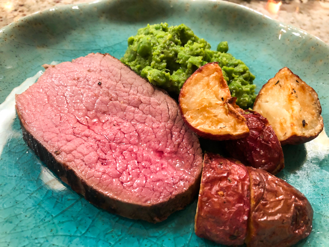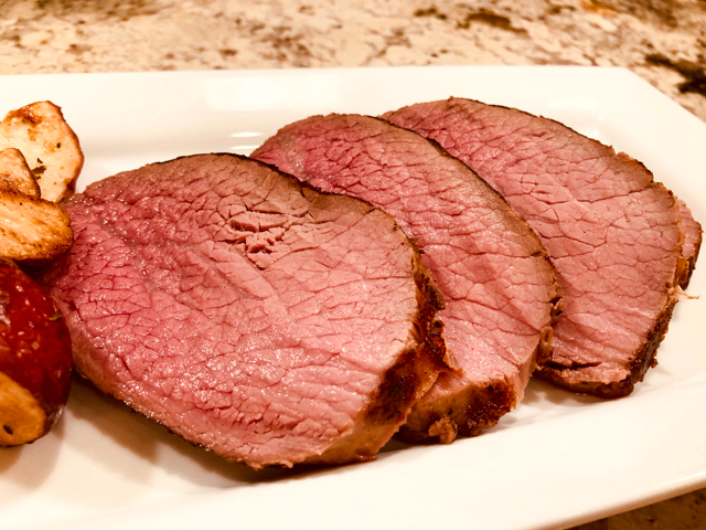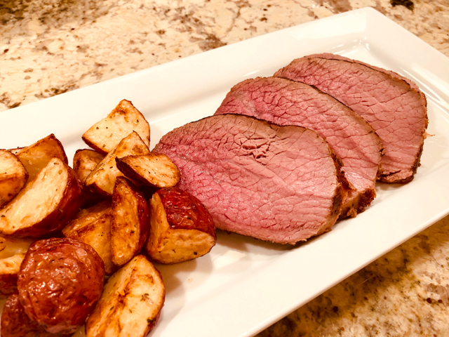 We enjoyed it with air-fried small potatoes, and broccoli puree. Leftovers were my lunch for three days in a row, just briefly warmed over a non-stick pan with a touch of olive oil. If you enjoy roast beef served cold in sandwiches, just make sure to slice whatever is left very thinly, if you have an electric knife (I don’t) put it to use.