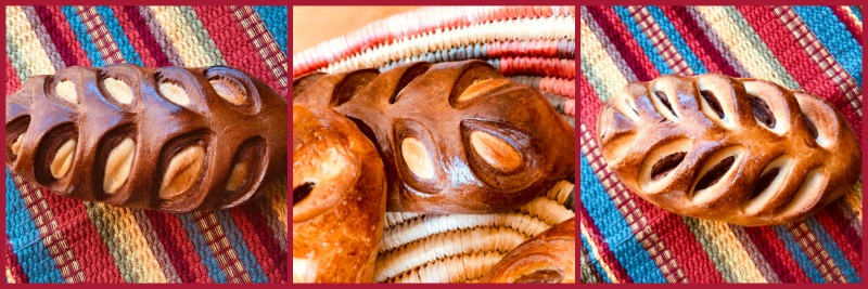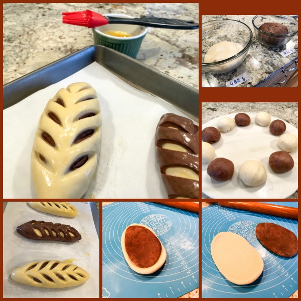 Divide each dough in five portions, each between 90 and 95g. Form each as a little ball and let rest for 10 minutes. Roll each as a long oblong shape about 4mm thick. Place different colors of dough on top and bottom, form as little loaves, seam at the bottom. Use a very sharp blade to make slashes on the surface, being very determinate. Any hesitation and the cut won’t be sharp enough. You need to see the different color of dough showing underneath. Place the shaped and cut loaves over parchment paper and let them proof at room temperature for 1 hour and 15 minutes.