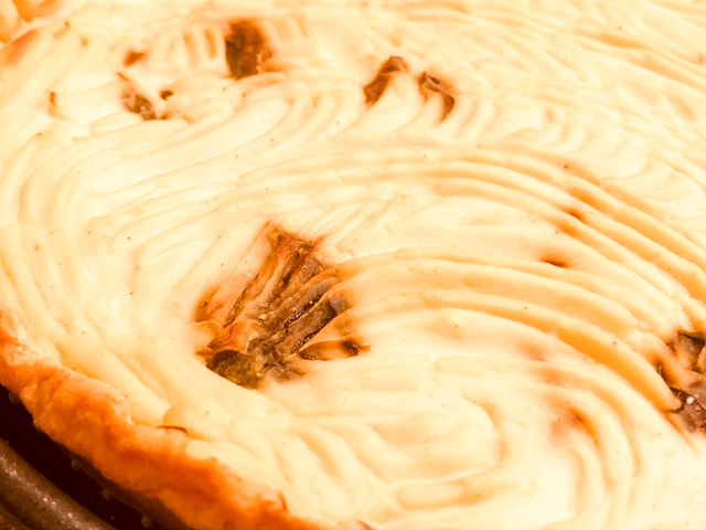 Bake for 30 minutes. If you like a darker topping run it under a broiler protecting the edges of the pie crust. Allow the pie to cool for 15 minutes before slicing.