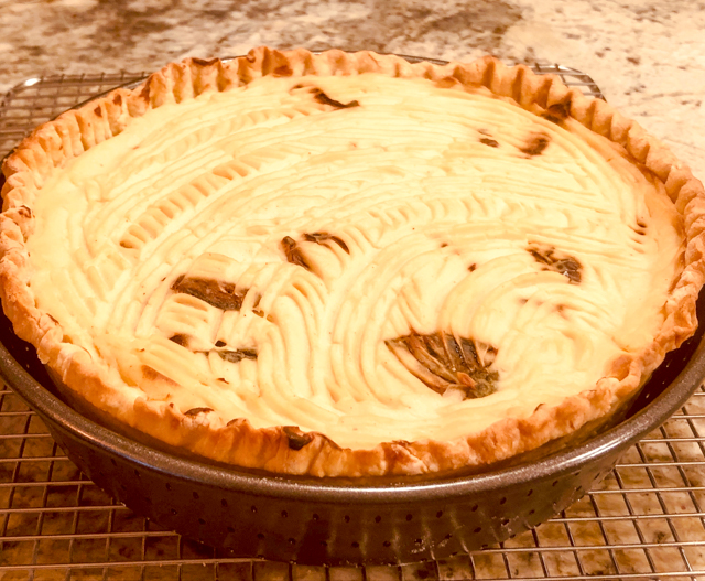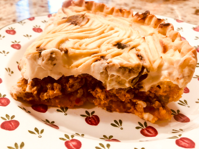 We don’t eat sweets that much. I bake a lot but it all goes to departmental colleagues, senior citizens at our town center, and homeless meals. What is a baker to do, when a pandemic forces everyone into isolation and she has very limited outlets to share sweets? She bakes savory stuff, that is. Like this crazy departure on Shepherd’s Pie, made lighter because the topping is cauliflower-based. The lightness is immediately neutralized by enclosing it in a pie crust. It all balanced out beautifully, and we were both quite pleased with our dinner. Normally I would make a salad to go with it, but it felt like a complete meal without it.