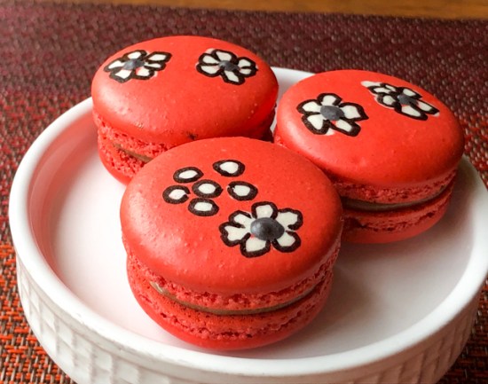 While the macarons are drying, heat the oven to 300 F. Bake one sheet at a time on the middle rack. Check in 11 minutes. If the tops slide or move (independently of the ‘feet’ when you gently twist the top), then bake for 2 to 3 more minutes. Check one or two. If they move when gently touched, put them back in the oven for 1 to 2 more minutes until they don’t move when touched. Let the macaroons cool for 10 minutes before removing from the pan. The macarons should release without sticking. When the shells are cold, made the black decorations with a food pen, for the lady bug’s body and the outline of the flowers and hearts. If desired, paint the lady bug’s head  with Royal Icing or Candy melts dyed black. Before it sets, sprinkle black sanding sugar.