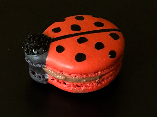 Comments: In the video, the decorations for the lady bugs were made with piped Royal Icing, but I decided that a food pen was simpler. Also, you can make antennas with candy melts piping them on parchment or acetate, allowing them to fully set, and then stick them in between the two shells, held by the filling. Some bakers use licorice strands cut in small pieces. Since my macs are donated and each must be wrapped individually, I skipped the antennas. My Lady Bugs are mutants, and I hope they don’t hate me for that.