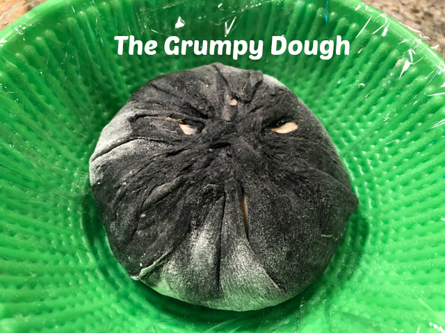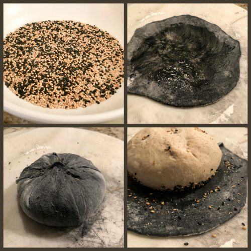 Proof at room temperature for 3 hours, folding every 30 to 45 minutes. After 3 hours, remove a small portion of the dough (about 65g) and dye with charcoal powder if you want to make it black. Leave it plain if you prefer. Roll this portion as a circle (about 6 inches in diameter), then brush the center with olive oil, leaving a margin without oil, so that it will stick to the main dough.