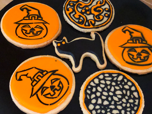To make the stenciled cookie, I flooded the whole cookie with orange Royal Icing, and allowed it to fully set for a couple of hours. I don’t have one of those magnetic gadgets to hold the stencil firmly on top of the cookie, so I improvised. I placed a cookie cutter on top of the stencil, and that was enough to get a sharp design with the air-brush, using black dye. Allow the design to dry for a couple of hours and you’ll be ready to enjoy your spooky cookie!