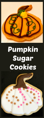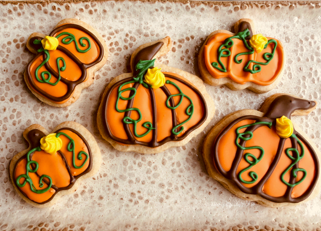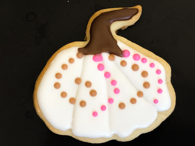 In her Bake Along tutorial, Tanya taught a pretty cool alternative style for a pumpkin cookie, and I loved her idea. Start with a white pumpkin, and go with piping dots for the details. How cute is that?