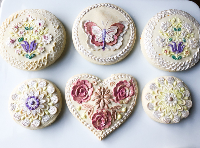 Comments: For the dressed-up version, I added white Royal icing to make abstract swirls, and immediately sprayed the shells with Diamond Dust, a product I will feature very soon in my next In My Kitchen post. Love it.