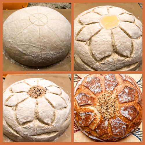 Next morning, heat the oven to 450F. Invert the dough over parchment paper, rub gently white flour on the surface. Score with a flower pattern and paint the details with a bright color using luster powder diluted with vodka. You need it to be a bit on the thick side, and don’t worry about precision, it will more or less mix with any flour bits around it. Do not worry. Paint the center of the flower pattern with egg wash and gently press sesame seeds on it.
