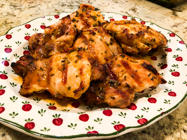 One of our favorite main dishes, boneless chicken thighs cook on the grill very fast and always turn out moist and tender. For this marinade, make sure you leave it several hours in the fridge, the acidity in the lemon won’t affect the texture and the flavor will be much more pronounced. Yes, that is a lot of meat for two people, but we always cook with leftovers in mind.