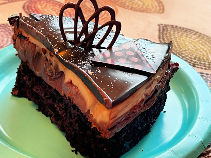 Please, do not allow the vegan word to scare you away. This was one of the tastiest cakes I’ve ever made, and I simply cannot BELIEVE it is vegan. The recipe comes from Fran Costigan’s cookbook: Vegan Chocolate, Unapologetically Luscious and Decadent Dairy-free Chocolate Desserts. Ms. Costigan has decades of experience creating dairy-free cakes and concoctions that do not rely on margarine and tofu like most do. As she points out in the introduction of the book, you can always taste margarine in the icing, and tofu will never fail to make a cake heavy. This cake – included in her “Showstoppers” chapter – is a bit involved to make, but one of the things I love about her cookbook is that she lays out a timetable suggesting how you can break the process in stages in a smooth and efficient way. I made the cake, the vanilla custard cream, and the chocolate decorations two days before. Made the mousse, assembled the cake and covered with the glaze the day before showtime. Basically, the cake was ready and waiting in the fridge before we had to take it to a get-together with friends. All that was left to do was add the chocolate decorations. Piece of (vegan) cake!