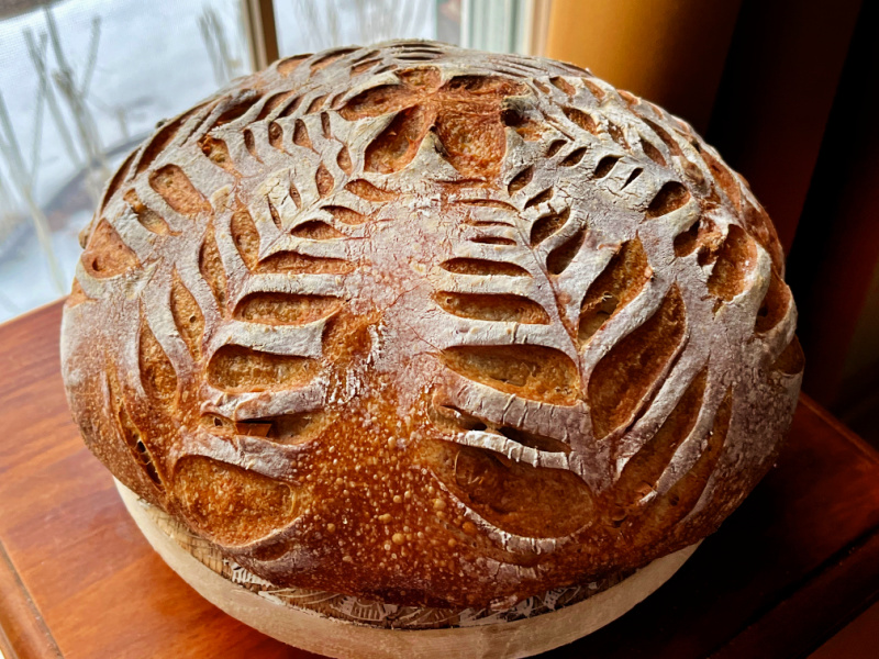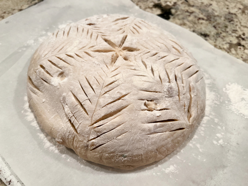 - Next morning, heat the oven to 450F. Invert the dough over parchment paper, rub gently white flour on the surface. Score with any pattern you like.