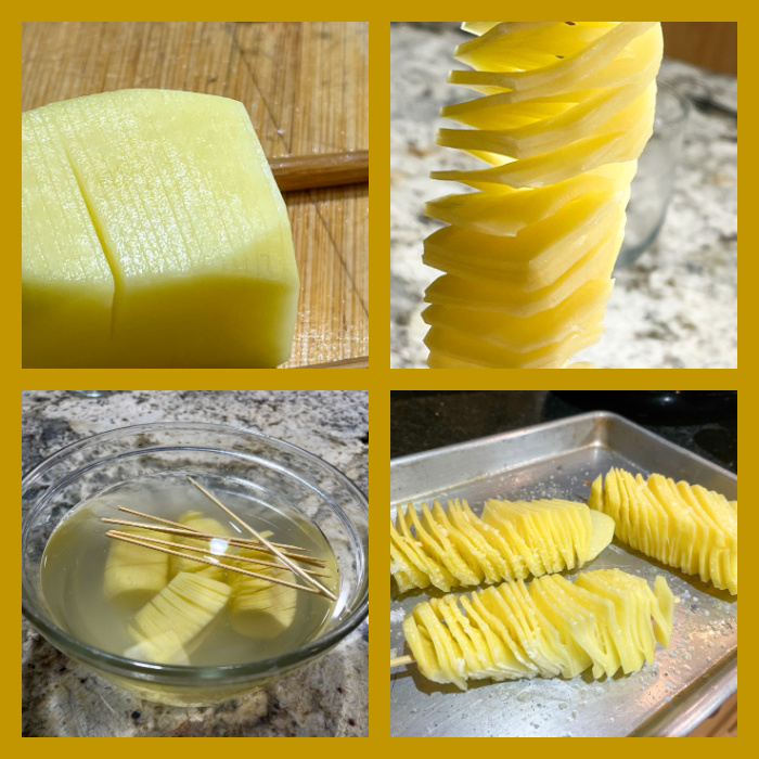 Thread a wooden skewer in the center of the cut potato and carefully open it like an accordion. Soak the potatoes and skewers in cold water for 30 minutes or so. Dry very well. Spray olive oil, season with salt and pepper and air-fry until golden brown, flipping the pieces every 5 minutes or so. Time will vary, depending on the power of your air-fryer and size of the potato.