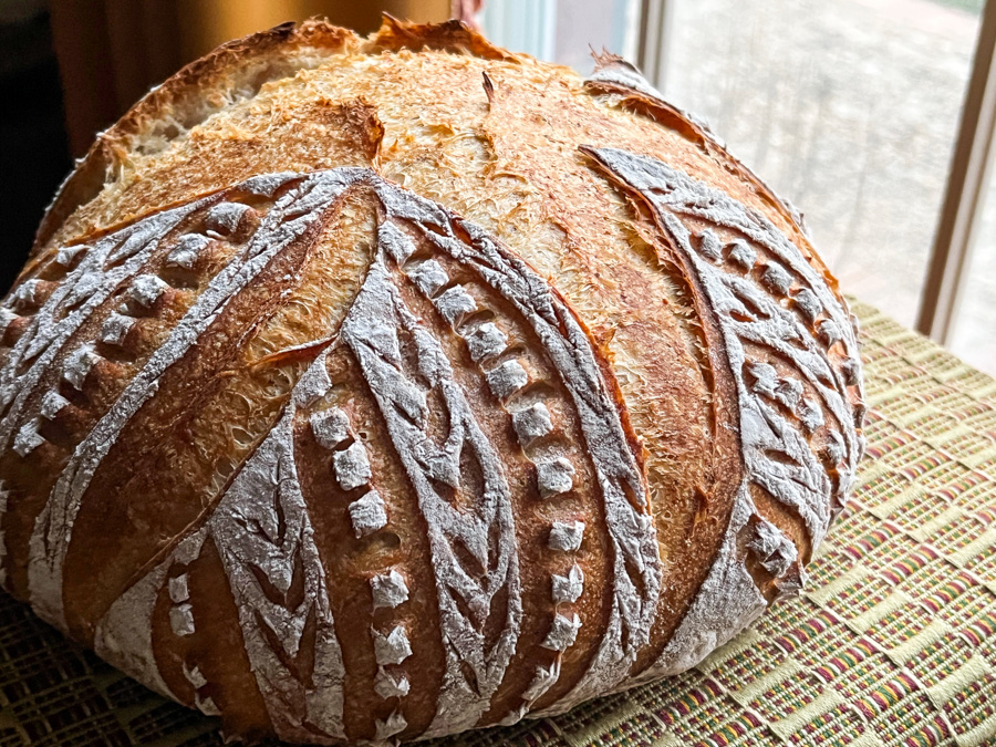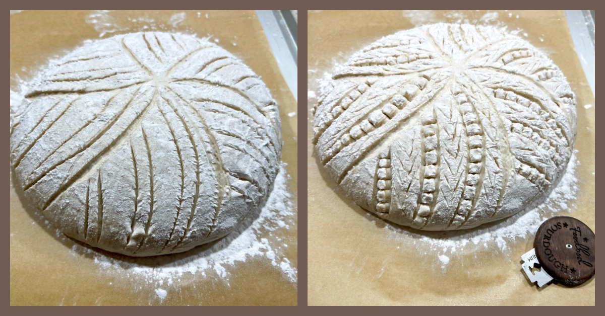 Comments: I went a little blade-crazy with the scoring, using my new blade, this beauty with the logo of my dear friend Elaine, Foodbod Sourdough. Click here to get yours. The square cuts I made with small scissors, the same I use for cutting piping tips, very small blade.