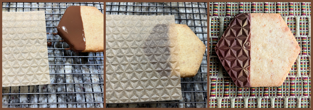 These are shortbread type cookies with macadamia nuts and coconut, absolutely delicious! I made the chocolate glaze in two different ways, one simply dipping like Helen suggests, and the second way adding some texture. To do so, I laid a piece of textured paper on the chocolate while still wet as shown below. It is hard to get it smooth to the very edge of the chocolate, but I still liked the effect.