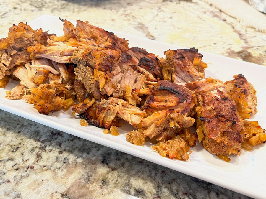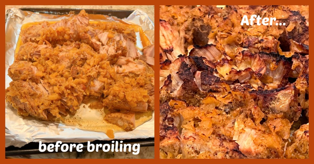 Place a rack in the upper third of your oven and heat the oven to broil. Line a large, rimmed baking sheet with aluminum foil and coat the foil with nonstick spray. Shred the pork while it is still inside the slow cooker, stir the pieces to coat with the sauce, then place over the prepared baking sheet. Broil until the edges of the meat begin to crisp up and turn brown.