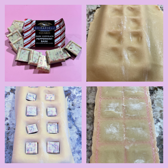 The composite picture below shows the steps right before chaos. In theory, you roll the cookie dough, lay on the mold, add your filling, close with another cookie sheet, smooth everything with the cute rolling pin provided. For the square ravioli, I used Peppermint Bark, cut in four small pieces. They fit so nicely in the allotted space! But that was the last reason I would have to smile for a while…