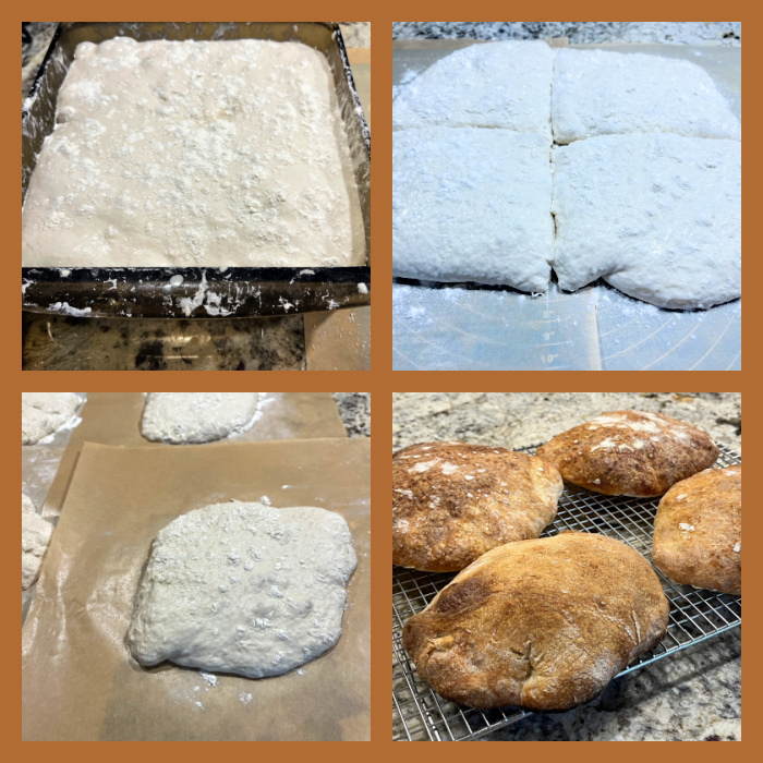 Next morning, place parchment paper over your countertop, and flour the surface of the dough, as well as the parchment paper. Flip the dough onto the floured paper, then divide it with a bench scraper in four pieces. Each piece should go into a separate piece of floured parchment paper for easy moving into the oven. Cover the pieces and let them proof at room temperature for 45 minutes.