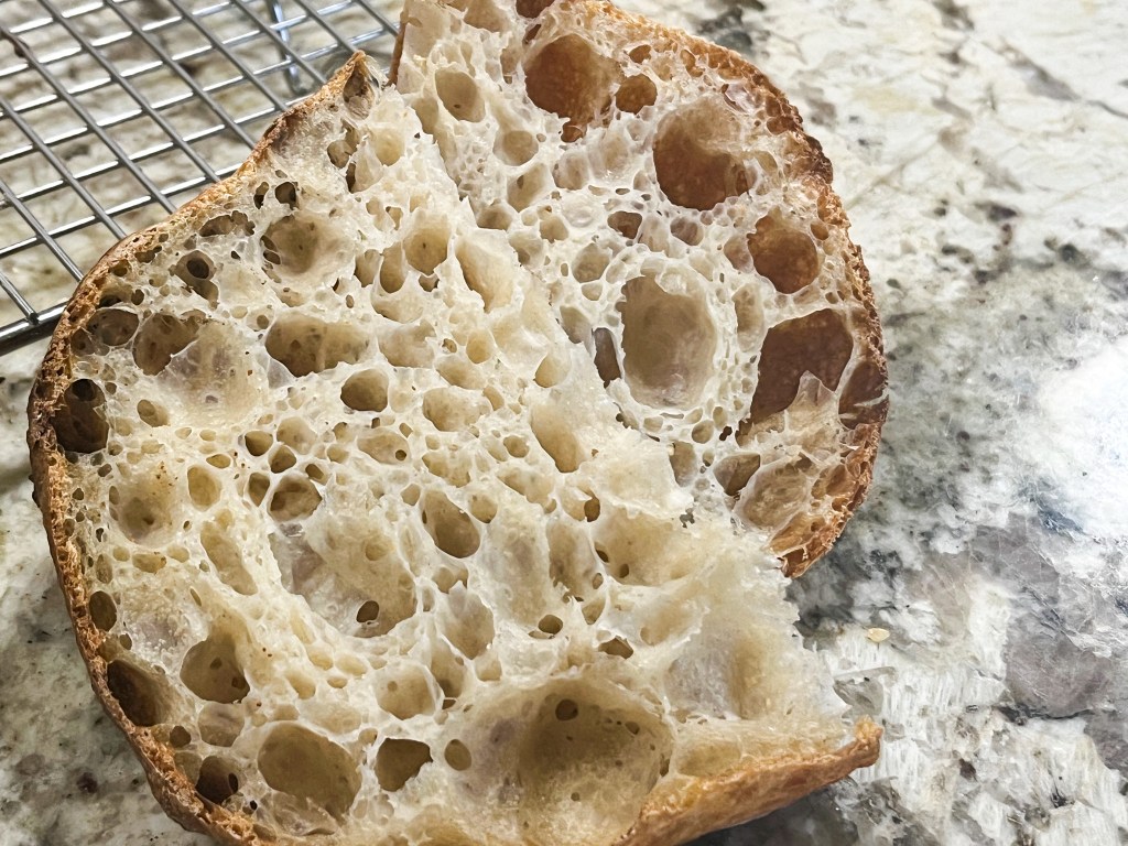 The crumb was very open and airy, the bread is delicious and was perfect for pulled pork sandwiches on the 4th of July… If you like to have a little bread baking challenge, I highly recommend this recipe!