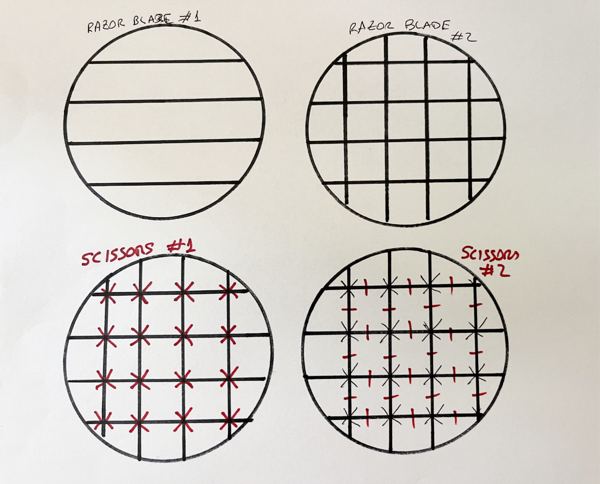 For this one only a razor blade was used, after marking the different sections with a string. Steps are shown below.