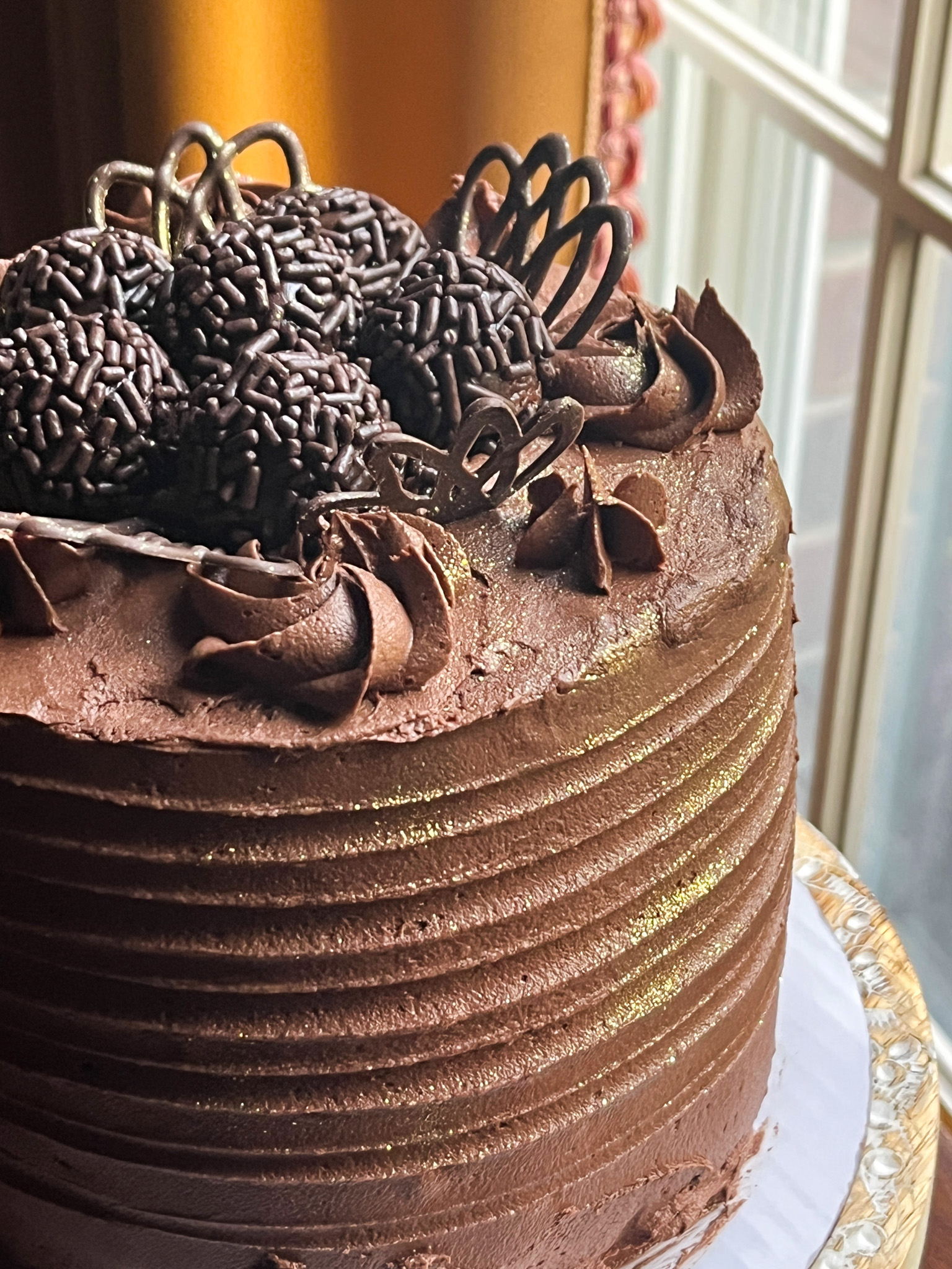 Place the first cake on a circular cardboard, add a circle of buttercream as a dam around the perimeter, fill the center with jam. Place second cake on top, repeat the process. Place the last cake on top, cover with a thin crumb cake layer of buttercream and refrigerate for 30 minutes. Finish the buttercream icing, add brigadeiros if so desired, or any other decorations.