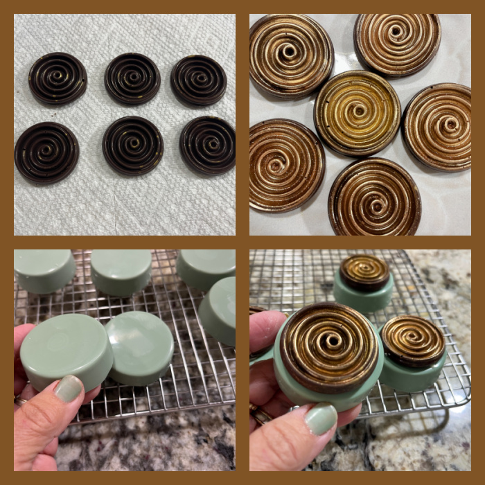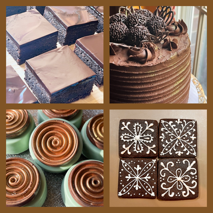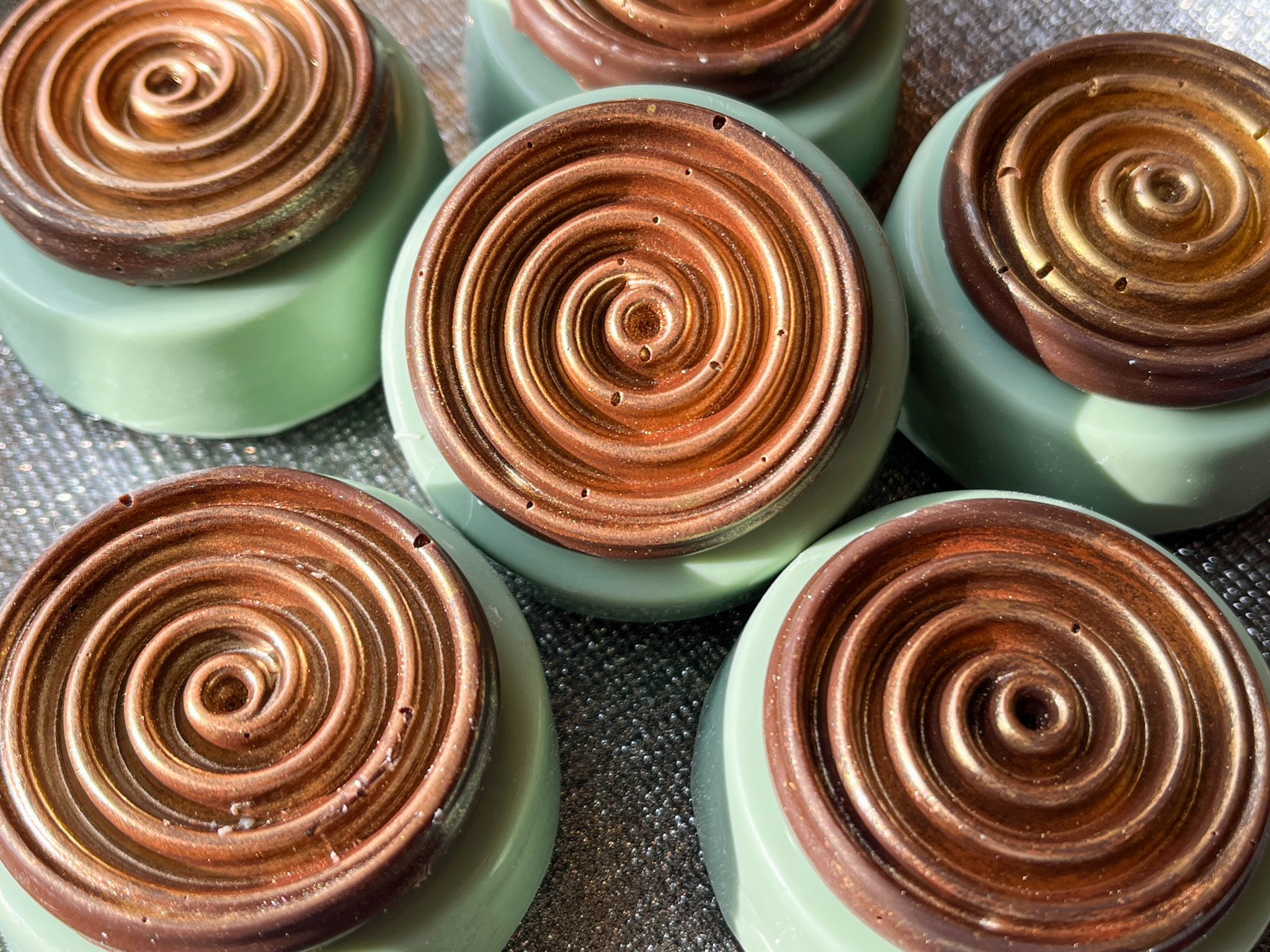 These turned out so cool, I was super happy with them. My sister Norma pointed out they reminded her of Leonardo da Vinci’s inventions, so that’s the reason for the name. I used a silicone mold I’ve had for many years to make the decorations with dark compound chocolate, later brushed with luster powder copper. I used a very light green to tint the chocolate for the molds.