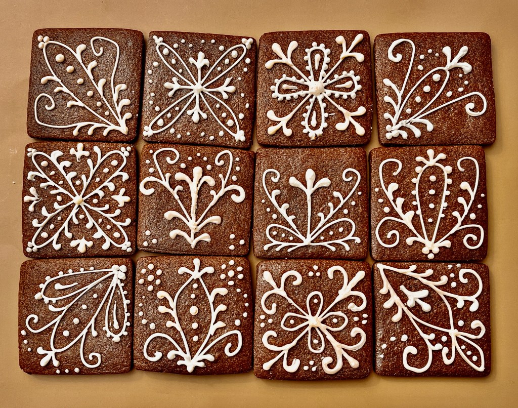 Finally, I close this post with a series of chocolate cookies decorated according to a tutorial from Tunde Dugantsi. Simple white Royal icing, good practice for fine line piping. It would also work well on gingerbread cookies, keep that in mind. I used my default chocolate cookie recipe for those (find it here).