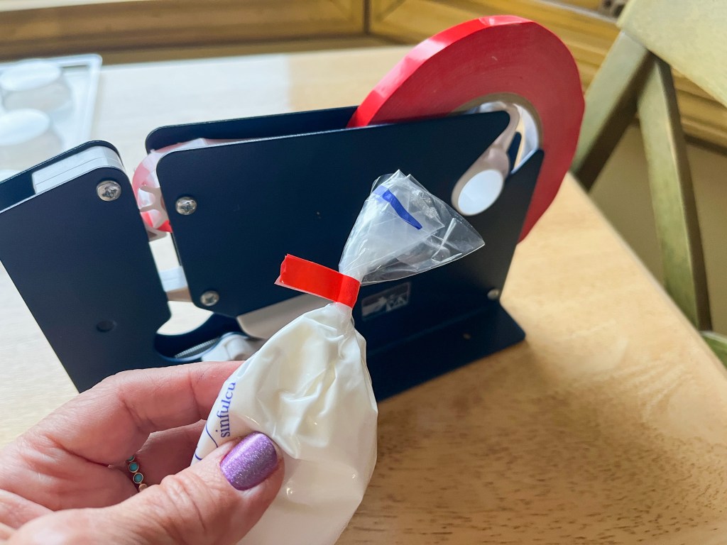 I saved the best for last. This is the best acquisition ever if you are a cookie decorator! I am so in love with it, I don’t know how I lived without it. Seriously. You stick the bag with icing through the opening and slide it down. It comes out with the tape neatly closed around it. No mess, no struggle with bands. Works also with bigger bags of buttercream if you need. Available at amazon (click here). The tape is not sold with it, must be ordered separately.