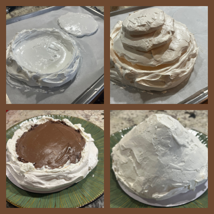 Make the meringues: Heat the oven to 225 degrees and line two large baking sheets with parchment paper. On one sheet of parchment, trace a 7-inch-wide circle and a 6-inch-wide circle. On the other sheet of parchment, trace a 4-inch-wide circle and a 2½-inch-wide circle. Flip the parchment papers upside down so the marks are underneath.