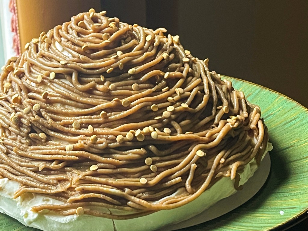 Place the 6-inch meringue disk on top, pressing gently. Spread a thick layer of whipped cream over the meringue and top with the 4-inch disk. Repeat with another generous layer of whipped cream, then add the smallest disk. Finish with a final helping of the remaining whipped cream, shaping it into a conical peak with an offset spatula. Chill the Mont Blanc in the fridge for about 1 hour, until the cream has firmed up enough to support the chestnut strands you’ll add on top (be sure to give it a wide berth in the fridge).