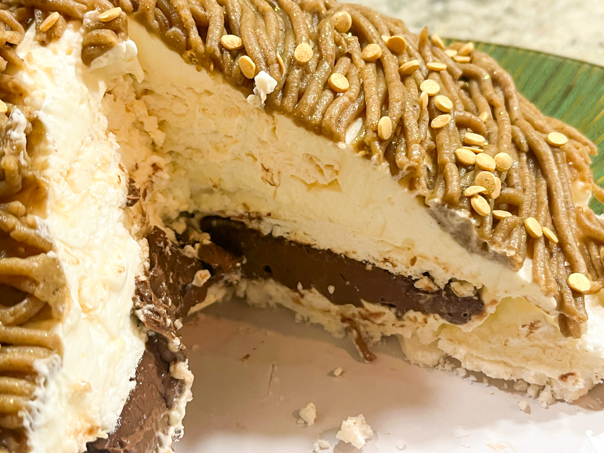 Final thoughts: Make the meringue discs the day before. Make the chocolate cremeux the day before. Then on the day of serving this beauty, just whip the cream and make the chestnut topping. I tried to use the special grass piping tip to make the ribbons, but it worked much better with a simple round open tip, about 2mm wide. Having my little turntable was a huge help. You can see it in action in this post from my past.